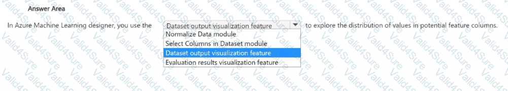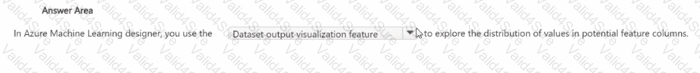 Therefore, based on official Microsoft documentation and AI-900 study materials, to explore the distribution of values in potential feature columns, you use the Dataset output visualization feature in Azure Machine Learning Designer.