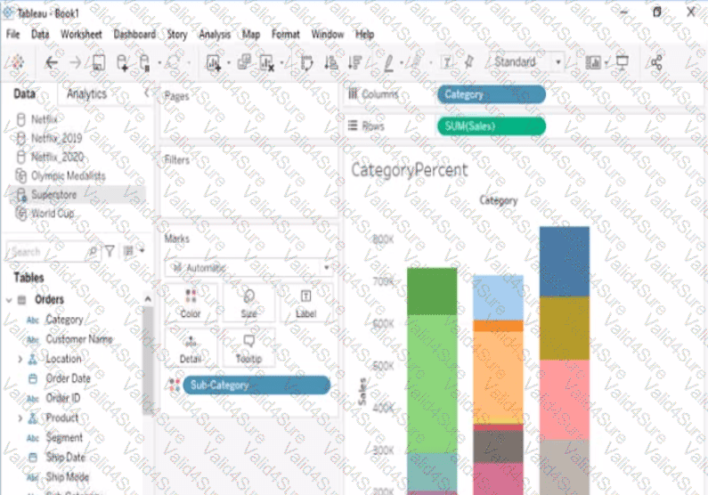 Modify the bar chart show the percentage of sales for each Subcategory within every Category. The total percentage for every Category must be 100%.