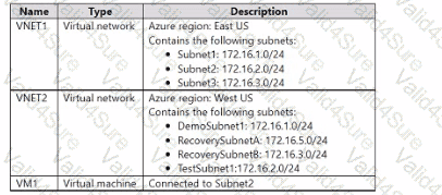 You perform a test failove of VM1 and specify VNET2 as the target v>riual network.