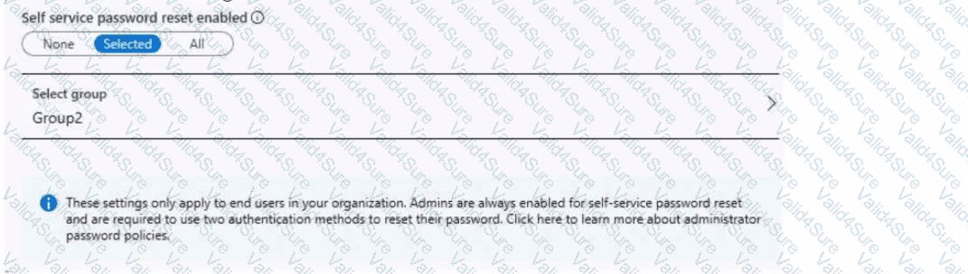 You configure the authentication methods for password reset as shown in the Authentication Methods exhibit. (Click the Authentication Methods tab.)