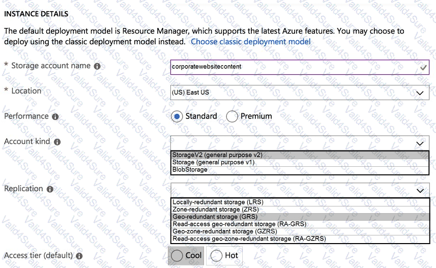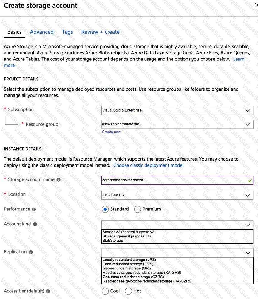 You need to configure the Account Kind, Replication, and Storage tier options for the corporate website’s Azure Storage account.