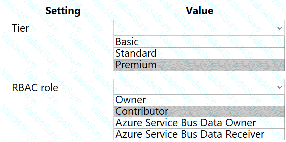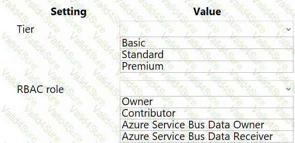 Which Azure Service Bus settings should you use? To answer, select the appropriate options in the answer area.