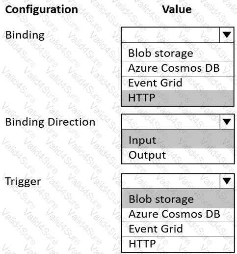 How should you configure the solution? To answer, select the appropriate options in the answer area.