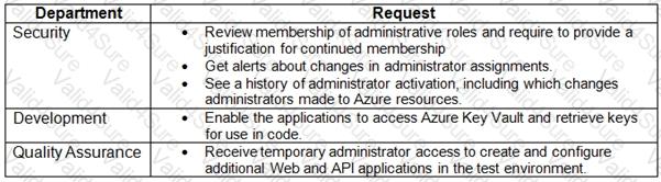 Your organization has developed and deployed several Azure App Service Web and API applications. The applications use Azure Key Vault to store several authentication, storage account, and data encryption keys. Several departments have the following requests to support the applications: