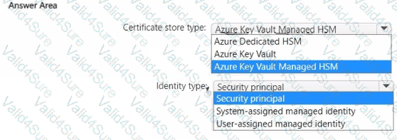 Which type of certificate store should you use, and which type of identity should you use to access the store? To answer, select the appropriate options in the answer area.