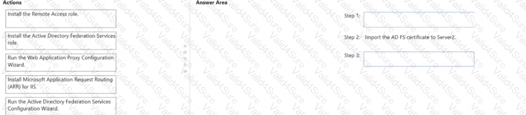 Which actions should you perform on Server2 in sequence? To answer, drag the appropriate actions to the correct order. Each action may be used once, more than once, or not at all. You may need to drag the split bar between panes or scroll to view content.