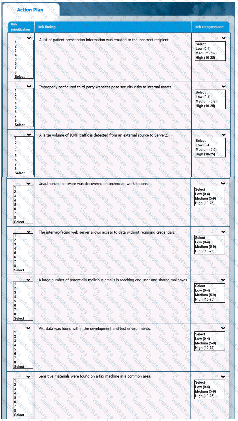 A healthcare organization must develop an action plan based on the findings from a risk assessment. The action plan must consist of risk categorization and prioritization.