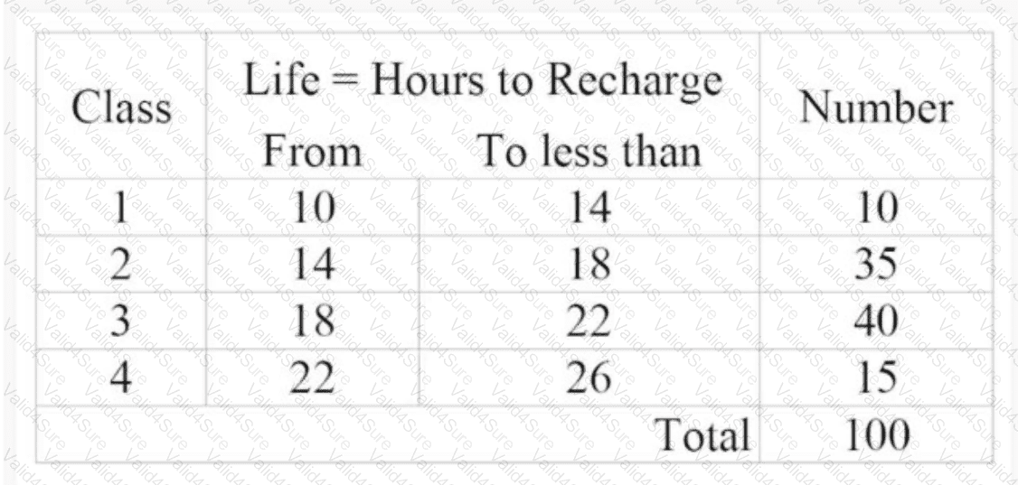 A frequency distribution of measurements for the useful life of rechargeable industrial batteries is shown below.