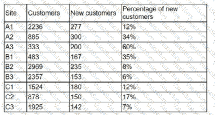 An analyst is designing a dashboard to determine which site has the highest percentage of new customers. The analyst must choose an appropriate chart to include in the dashboard. The following data is available: