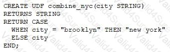 A data engineer needs to apply custom logic to string column city in table stores for a specific use case. In order to apply this custom logic at scale, the data engineer wants to create a SQL user-defined function (UDF).