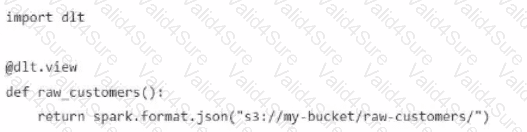 A Data Engineer is building a simple data pipeline using Delta Live Tables (DLT) in Databricksto ingest customer data. The raw customer data is stored in a cloud storage location in JSON format. The task is to create a DLT pipeline that reads the rawJSON data and writes it into a Delta table for further processing.