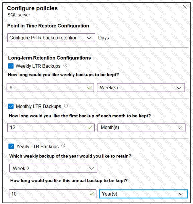 You configure a long-term retention policy for an Azure SQL database as shown in the exhibit. (Click the Exhibit tab.)