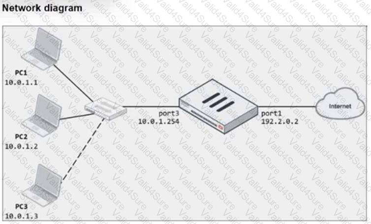 Two PCs, PC1 and PC2, are connected behind FortiGate and can access the internet successfully. However, when the administrator adds a third PC to the network (PC3), the PC cannot connect to the internet.