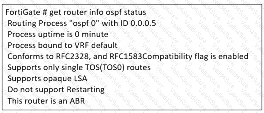 The partial output of an OSPF command is shown. While checking the OSPF status of FortiGate, you receive the output shown in the exhibit. Based on the output, which two statements about FortiGate are correct? (Choose two answers)
