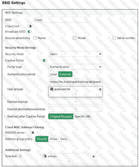 Examine the firewall policy configuration and SSID settings. Users trying to connect to the new Guest wireless network should be redirected to an external captive portal, however, these wireless users are not able to see the captive portal login page. The external captive portal URL has been verified as correct, yet the issue persists. Which configuration change should fix the problem?