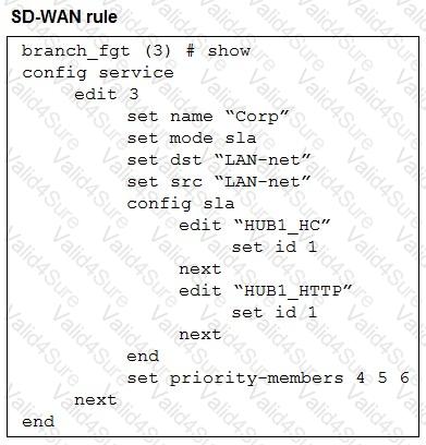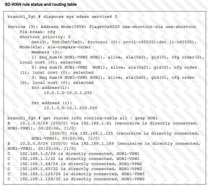 Refer to the exhibits, which show the configuration of an SD-WAN rule and the corresponding rule status and routing table.