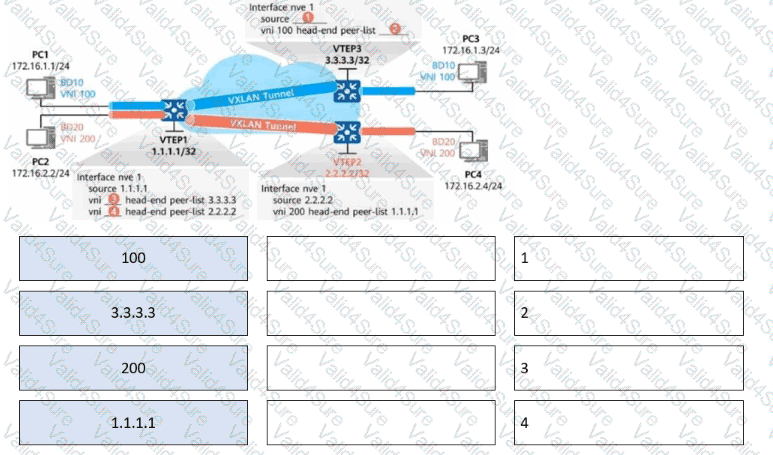 Complete the following static VXLAN tunnel configurations by dragging the configurations to the corresponding areas.