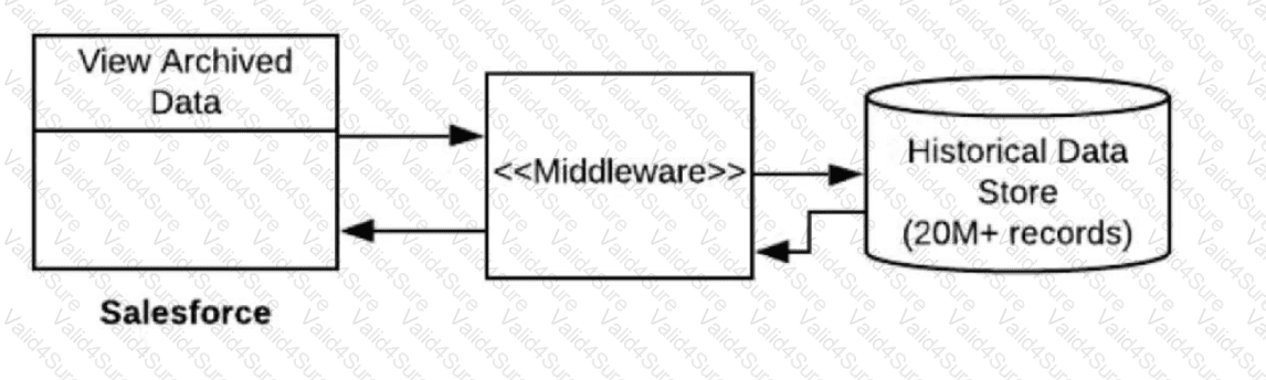Given the diagram above, a Salesforce org, middleware, and Historical Data store exist with connectivity between them. Historical records are archived from Salesforce, moved to a Historical Data store (which houses 20 million records and growing), and fine-tuned to be performant with search queries. When reviewing occasional special cases, call center agents that use Salesforce have requested access to view the historical case items that relate to submitted cases.