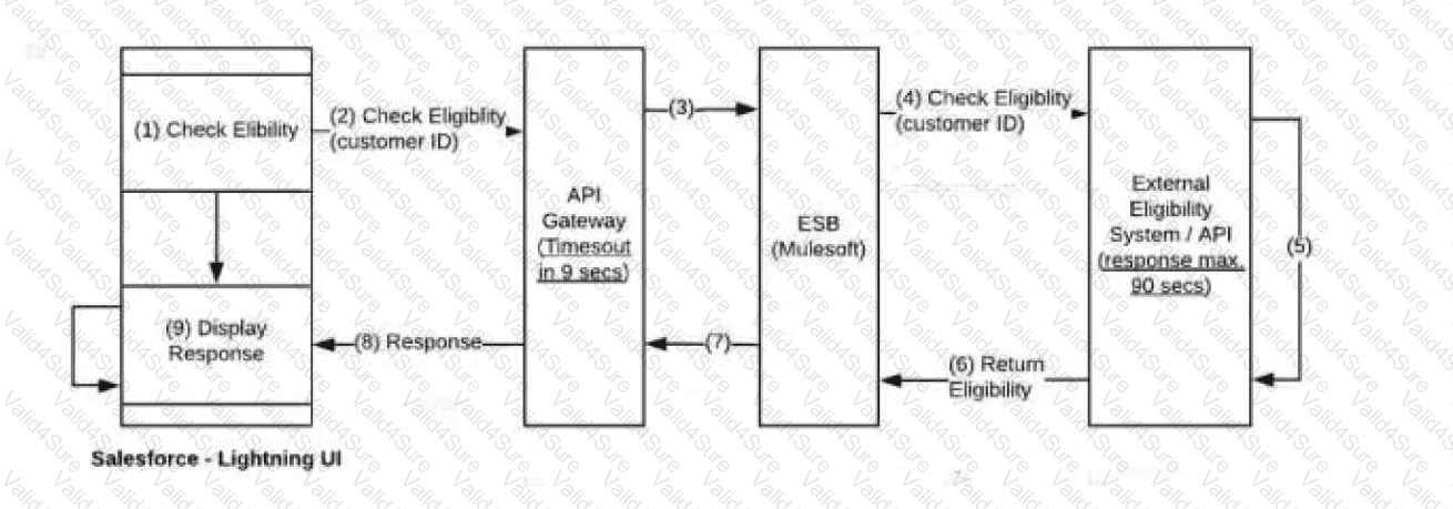 An enterprise architect has requested the Salesforce integration architect to review the following (see diagram and description) and provide recommendations after carefully considering all constraints of the enterprise systems and Salesforce Platform limits.