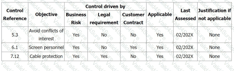 During the Stage 2 audit, your audit team found that there was no evidence of the implementation of the three controls (5.3 Segregation of duties, 6.1 Screening, 7.12 Cabling security) shown in the extract from the Statement of Applicability. No risk treatment plan was found.