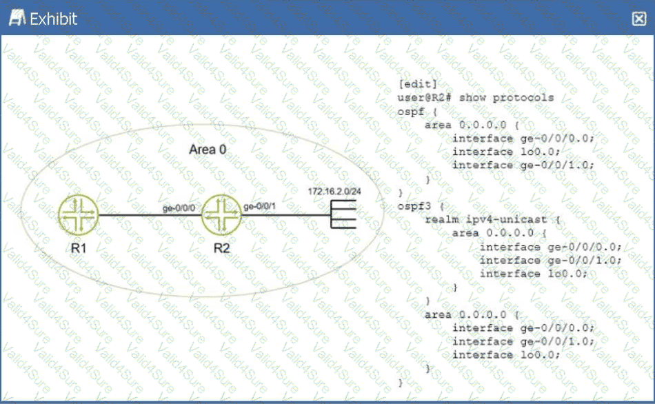 In the provided exhibit, routerR2has a dual-protocol configuration. First, it is running standard OSPFv2, with the ge-0/0/1.0 interface (which is directly connected to the 172.16.2.0/24 network) participating in Area 0. This ensures that the prefix is advertised as a standard IPv4 LSA to its neighbor,R1. Second, R2 is running OSPFv3 with the realm ipv4-unicast specifically enabled on that same ge-0/0/1.0 interface. Because of this realm, OSPFv3 also treats the 172.16.2.0/24 prefix as a reachable IPv4 destination and advertises it to R1 as an OSPFv3 IPv4-unicast LSA.