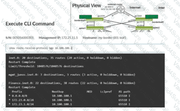 The same connectivity template is applied to the ge-0/0/6 interface on both borderleaf1 and borderleaf2 nodes. This connectivity template describes the intended configuration of the eBGP session between each of the borderleaf nodes and the external router. You want to ensure that the 172.23.x/24 routes are not installed in the borderleaf nodes’ Finance routing table.