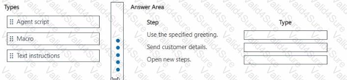 You ate creating agent scripts in Dynamics 365 Customer Service. You must add the following steps to the scripts: