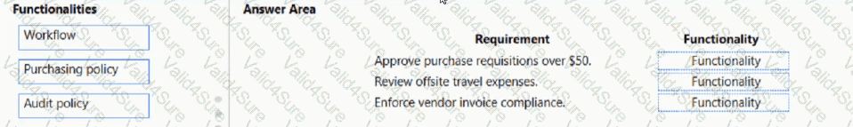 What should you recommend? To answer, drag the appropriate functionalities to the correct requirements. Each functionality may be used once, more than once, or not at all. You may need to drag the split bar between panes or scroll to view content