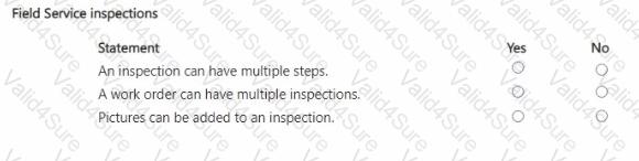 A company uses Dynamics 365 Field Service. Technicians in the company use work orders and inspections to complete their tasks. For each of the following statements, select Yes if the statement is true. Otherwise, select No.