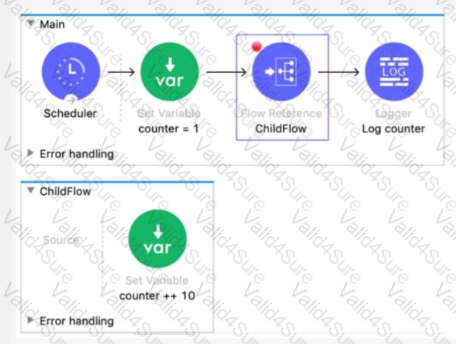 Refer to the exhibits. The Mule application is stopped at the breakpoint in Anypoint Studio. A watch expression Is set to the counter variable.