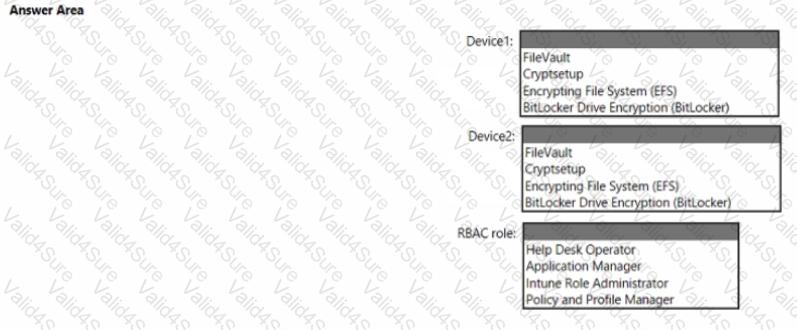 Which encryption type should you use for each device, and which role-based access control (RBAQ role in Intune should you use to manage the encryption keys? To answer, select the appropriate options m the answer area.