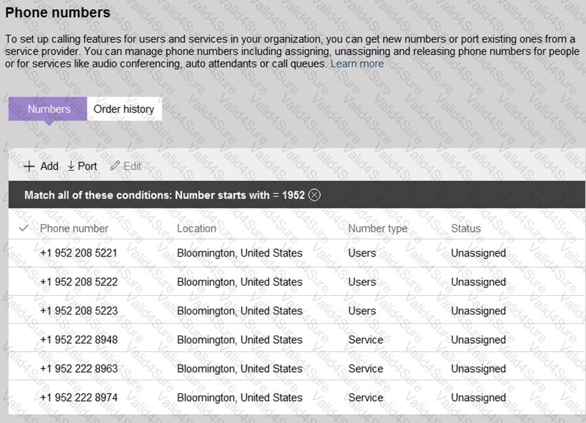 The available phone numbers are shown in the Phone numbers exhibit. (Click the Phone Numbers tab.)
