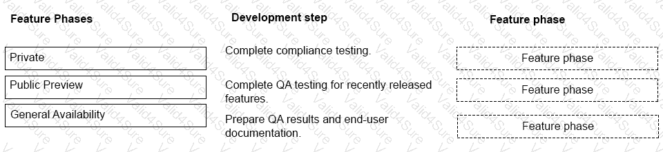 Which feature phase should you use for each development step? To answer, drag the appropriate feature phases to the correct development steps. Each feature phase may be used once, more than once, or not at all. You may need to drag the split bar between panes or scroll to view content