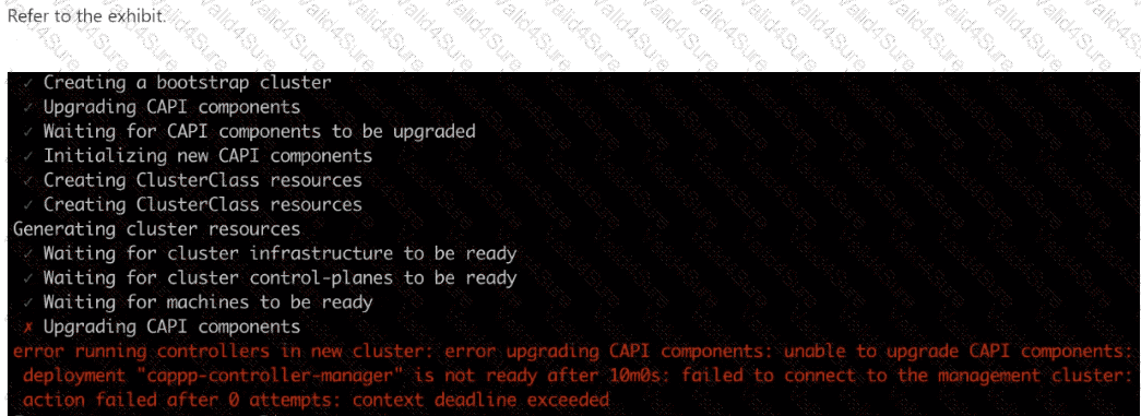 An administrator is provisioning an NKP cluster. After the VM creation task, the error shown in the exhibit is produced.