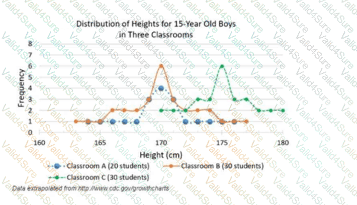 The graph displays the distribution of the heights of 15-year-old boys in three classrooms.