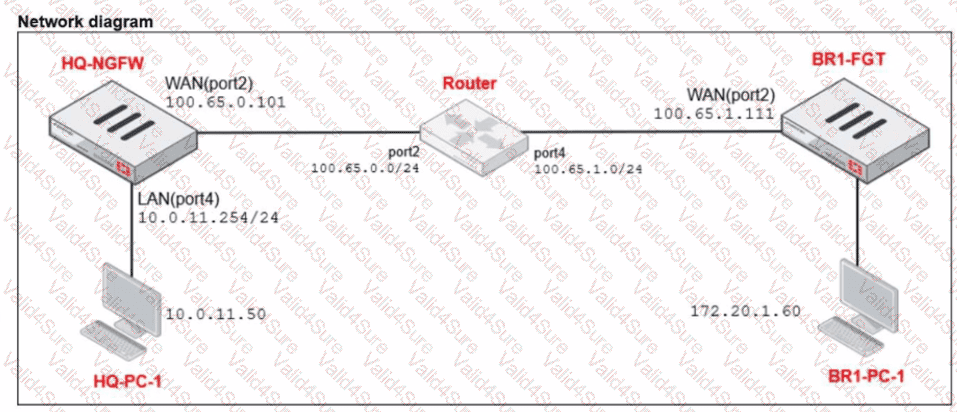 Which IP address will be used to source NAT (SNAT) the traffic, if the user on HQ-PC-1 (10.0.11.50) pings the IP address of BR-FGT (100.65.1.111)?
