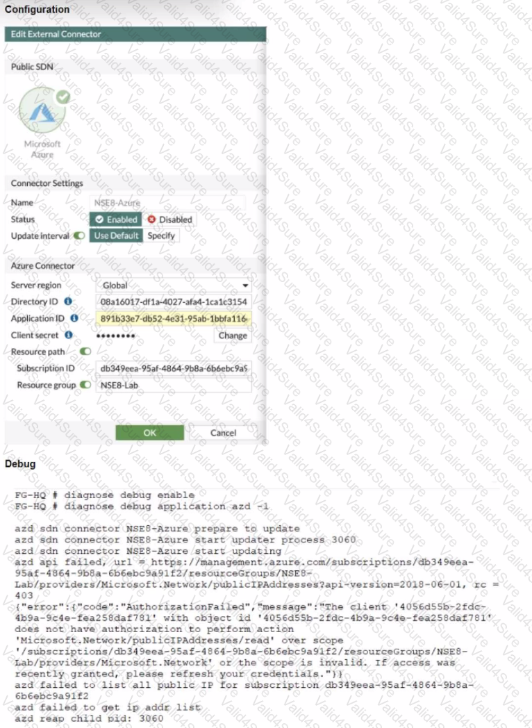 The exhibits show the configuration and debug output from a FortiGate Public SDN Connector.