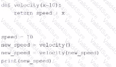 [Reference: Python Global Keyword - W3SchoolsPython Exceptions: An Introduction – Real Python, , The code is erroneous because it is trying to call the “velocity†function without passing any parameter, which will raise a TypeError exception. The “velocity†function requires one parameter “xâ€, which is used to calculate the return value of “speed†multiplied by “xâ€. If no parameter is passed, the function will not know what value to use for “xâ€., The code is also erroneous because it is trying to use the “new_speed†variable before it is defined. The “new_speed†variable is assigned the value of 20 after the first function call, but it is used as a parameter for the second function call, which will raise a NameError exception. The variable should be defined before it is used in any expression or function call., Therefore, the code will not run and will not produce any output., The correct way to write the code would be:, # Define the speed variable, speed = 10, , # Define the velocity function, def velocity(x):, return speed * x, , # Define the new_speed variable, new_speed = 20, , # Call the velocity function with new_speed as a parameter, print(velocity(new_speed)), Copy, This code will print 200, which is the result of 10 multiplied by 20., References:, [Python Programmer Certification (PCPP) – Level 1], [Python Programmer Certification (PCPP) – Level 2], [Python Programmer Certification (PCPP) – Level 3], [Python: Built-in Exceptions], [Python: Defining Functions], [Python: More on Variables and Printing], ]