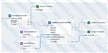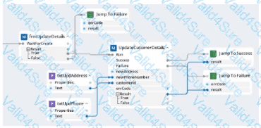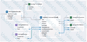 Within your project for a car renting company, you create an automation that reads data From an online form and calls a subautomation that saves that data in the company's application. The UpdateCustomerDetails subautomation has two exit points, Success and Failure, and two output parameters. Result and errCode.