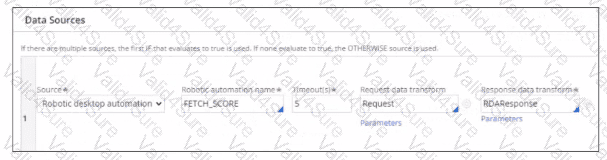 Using the values from the data page definition, the value FETCH_SCORE is configured for which robot activity property in Pega Robot Studio?