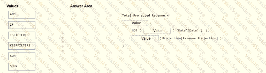 How should you complete the measure? To answer, drag the appropriate values to the correct targets. Each value may be used once, more than once, or not at all. You may need to drag the split bar between panes or scroll to view content.