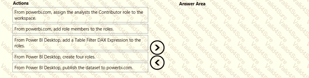 Once the profit and loss dataset is created, which four actions should you perform in sequence to ensure that the business unit analysts see the appropriate profit and loss data? To answer, move the appropriate actions from the list of actions to the answer area and arrange them in the correct order.