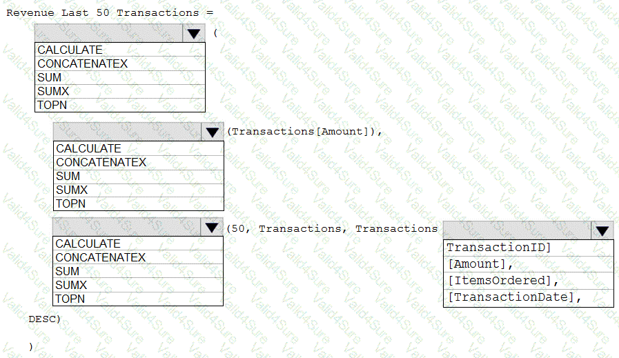 How should you complete the DAX expression? To answer, select the appropriate options in the answer area.