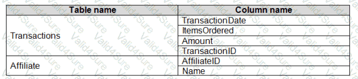The managers request a visual showing the total sales value of the latest 50 transactions for each affiliate. You have a data model that contains the following tables.