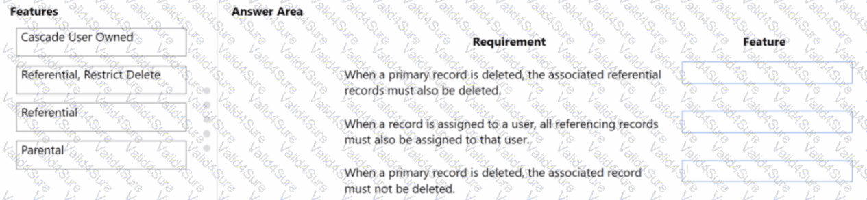 Which features should you select? To answer, drag the appropriate features to the correct requirements. Each feature may be used once, more than once, or not at all. You may need to drag the split bar between panes or scroll to view content.