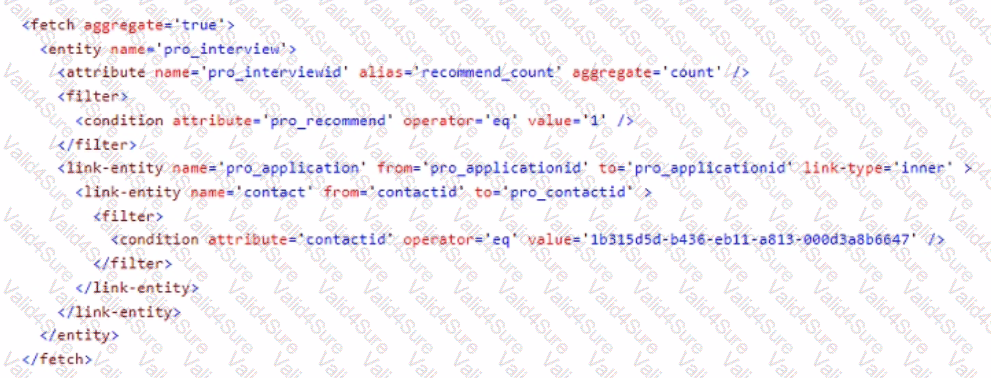 You create the following Fetch XML query to determine the number of interviews where there are no recommendations for an applicant.