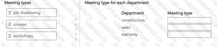 To answer, move the appropriate meeting types to the correct departments. You may use each meeting type once, more than once, or not at all. You may need to move the split bar between panes or scroll to view content.