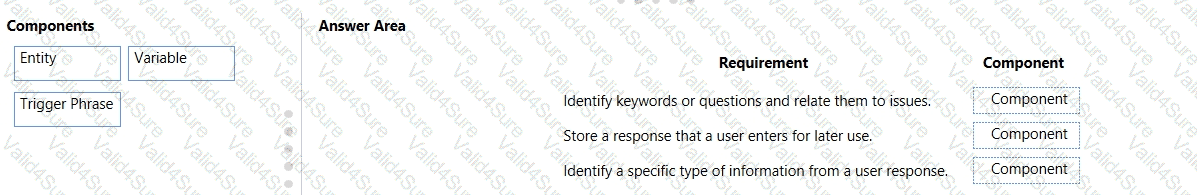 Which components should you use? To answer, drag the appropriate components to the correct requirements. Each component may be used once, more than once, or not at all. You may need to drag the split bar between panes or scroll to view content.