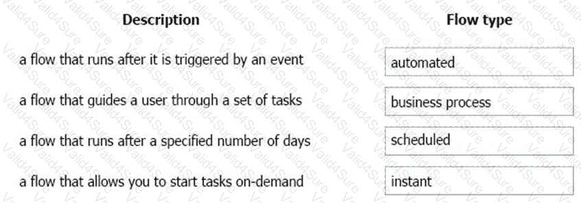 Match each flow type to its function. To answer, drag the appropriate flow type from the column on the left to its description on the right. Each option may be used once, more than once, or not at all.