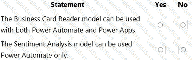 You are planning to use the Business Card Reader and Sentiment Analysis prebuilt AI models to build solutions.